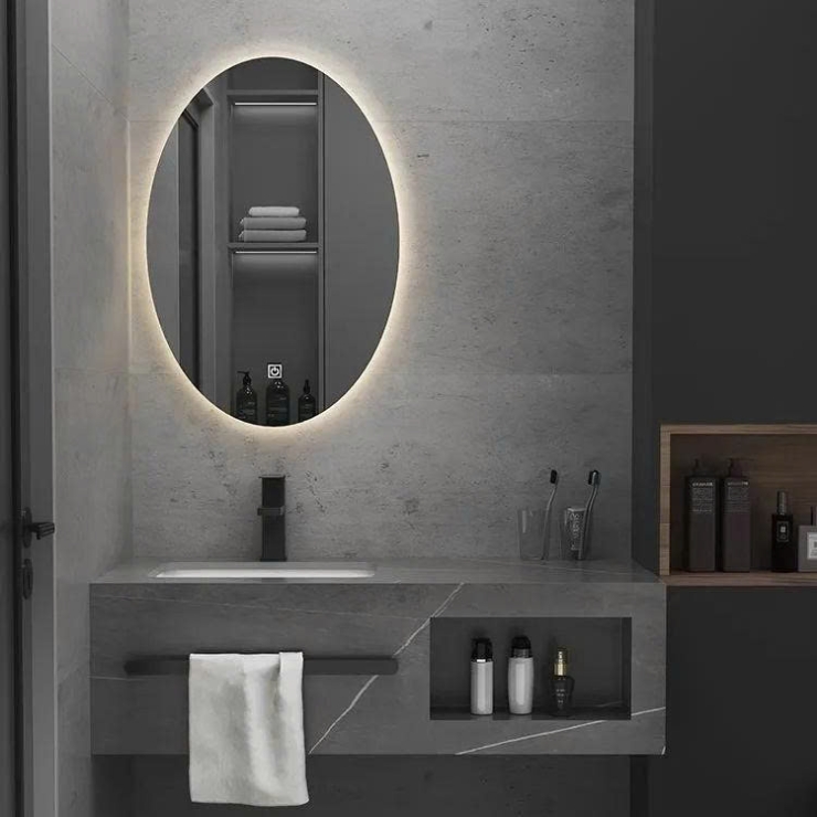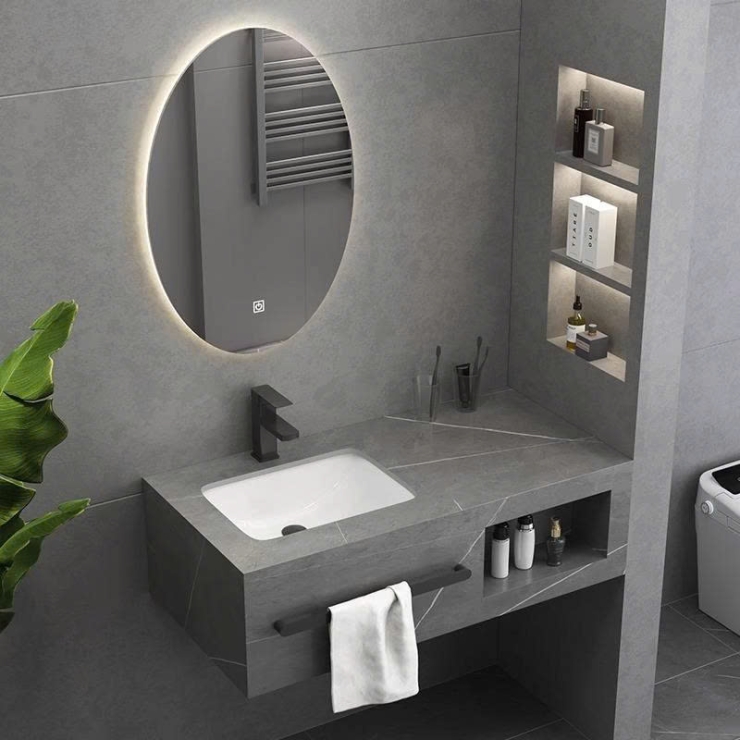 Bàn Đá 2 Tầng Vân Xám +Lavabo + Gương Tròn Led ( Kèm Vòi ) LUSENTER (BD04)