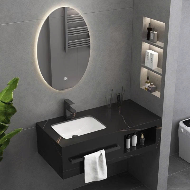 Bàn Đá Lavabo Âm 2 Tầng Vân Đen + Vòi + Gương Led LUSENTER (BD02)