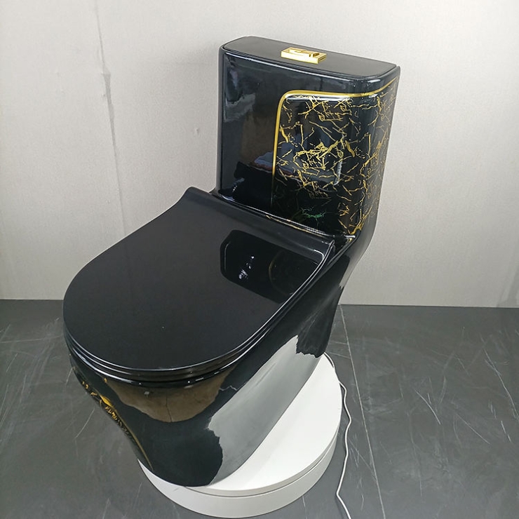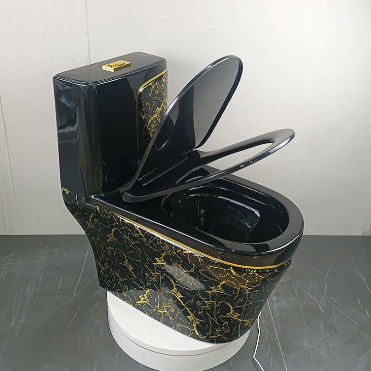 Bồn Cầu 1 Khối Đen Vân đá + Sọc Vàng LUSENTER (BCMK38)
