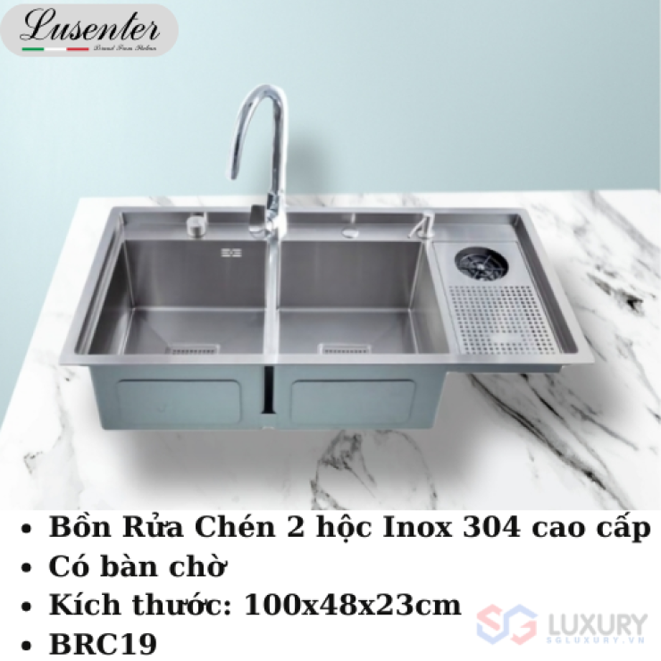 Chậu Rửa Chén Inox 304 - 2 Hộc - Có Bàn Chờ LUSENTER (BRC19)