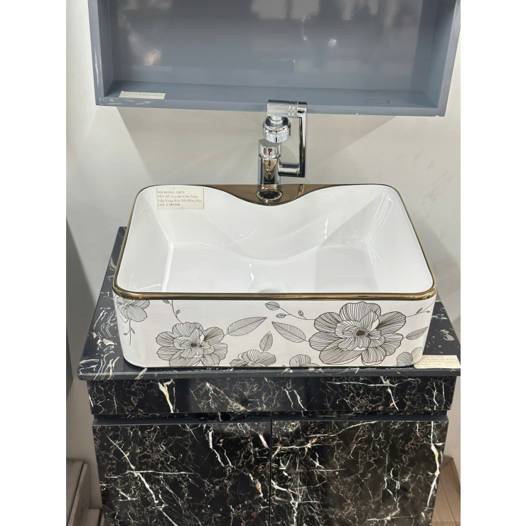 Lavabo Chữ Nhật Viền Vàng Họa Tiết Bông Hoa (LB73)