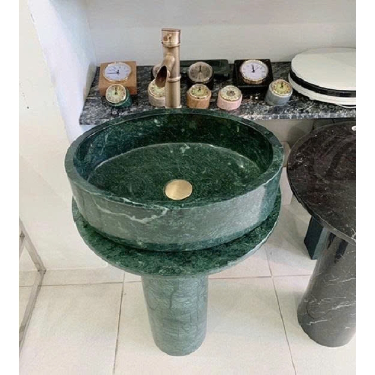 - Kiểu dáng: Lavabo tròn có chân trụ đứng, xanh Ấn Độ nhẹ tự nhiên, lòng chậu thiết kế đặc biệt hơi vát xuống chống bắn nước, mang nét tự nhiên hài hòa cho không gian đặt chậu trở nên sang trọng, quý phái