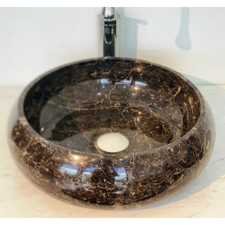 - Kiểu dáng: Lavabo tròn thân phình parabol, đá nâu vân nhũ tự nhiên, lòng chậu thiết kế đặc biệt chống bắn nước, mang nét hài hòa và tinh tế cho không gian đặt chậu trở nên sang trọng, quý phái