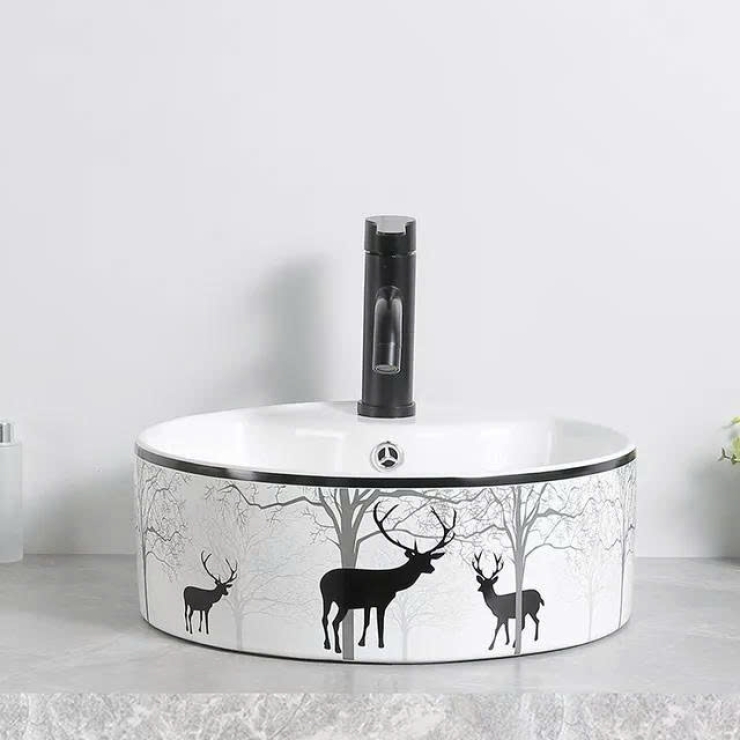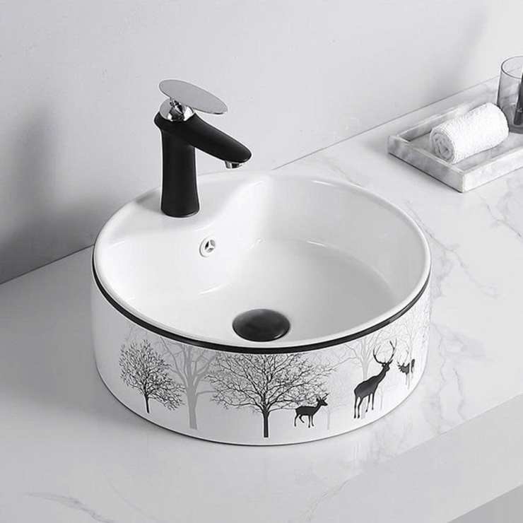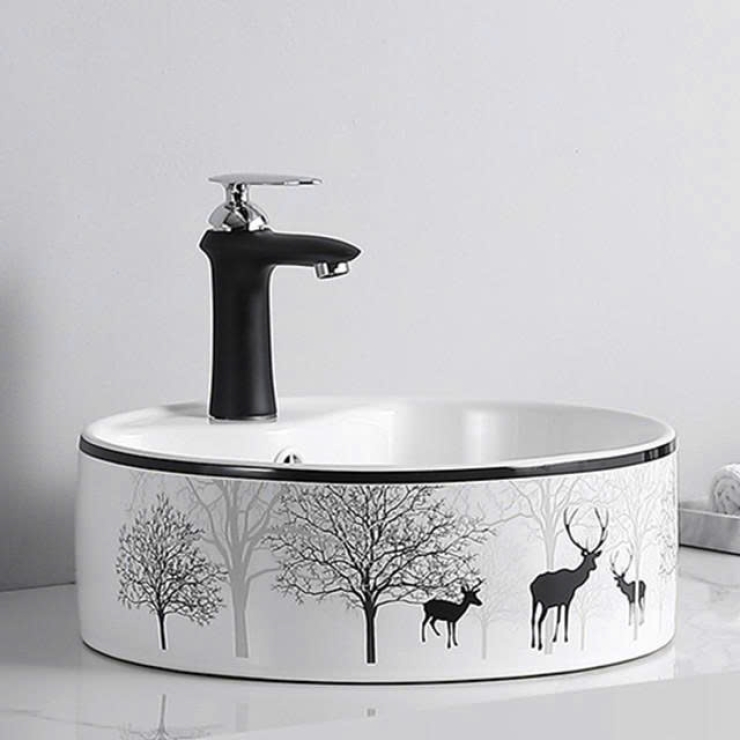 - Kiểu dáng: Tròn trắng kết hợp họa tiết hươu đen trong rừng, lòng khuyết có chỗ để vòi và chống tràn, mang lại kết cấu hài hòa, sang trọng và gần gũi cho không gian của bạn