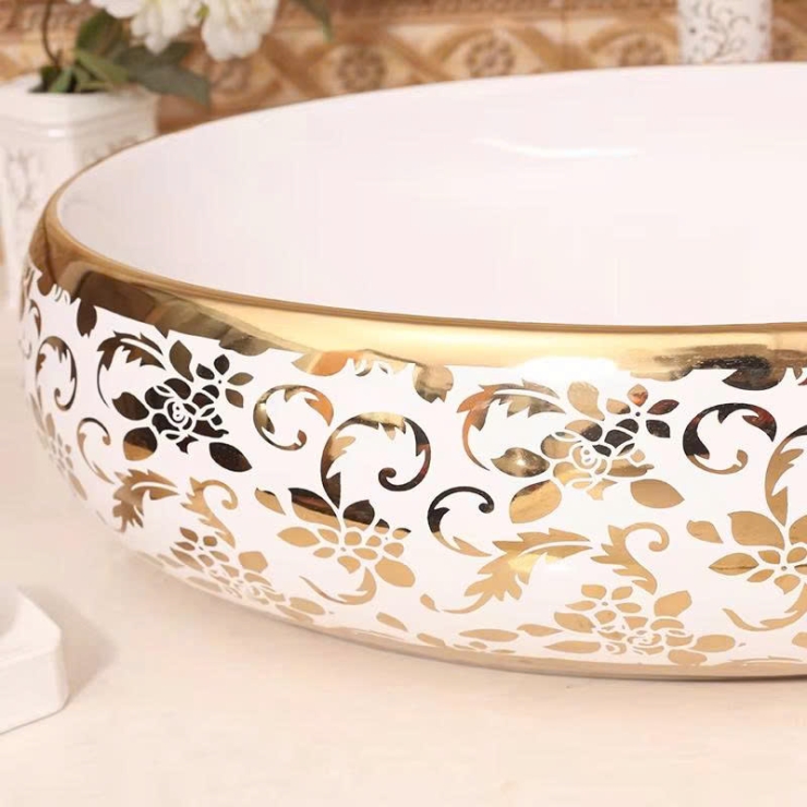 - Kiểu dáng: Chậu Lavabo Đặt Bàn Hình Elip viền vàng, kết hợp họa tiết lá vàng phủ bóng tinh sảo, lòng chậu có thiết kế đặc biệt giúp chống bắn nước, mang tính thẩm mĩ cao, làm cho không gian đặt chậu trở nên sang trọng, tinh tế, hài hòa (Có thể lắp đặt trên bàn đá hay tủ chậu).