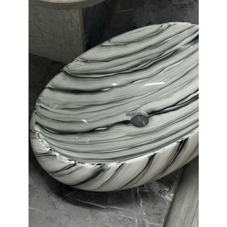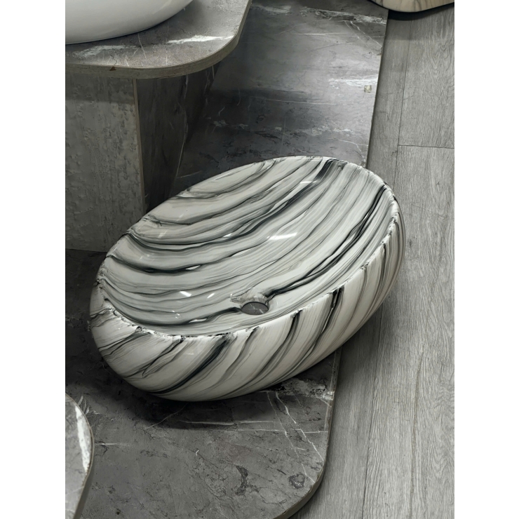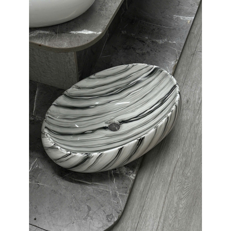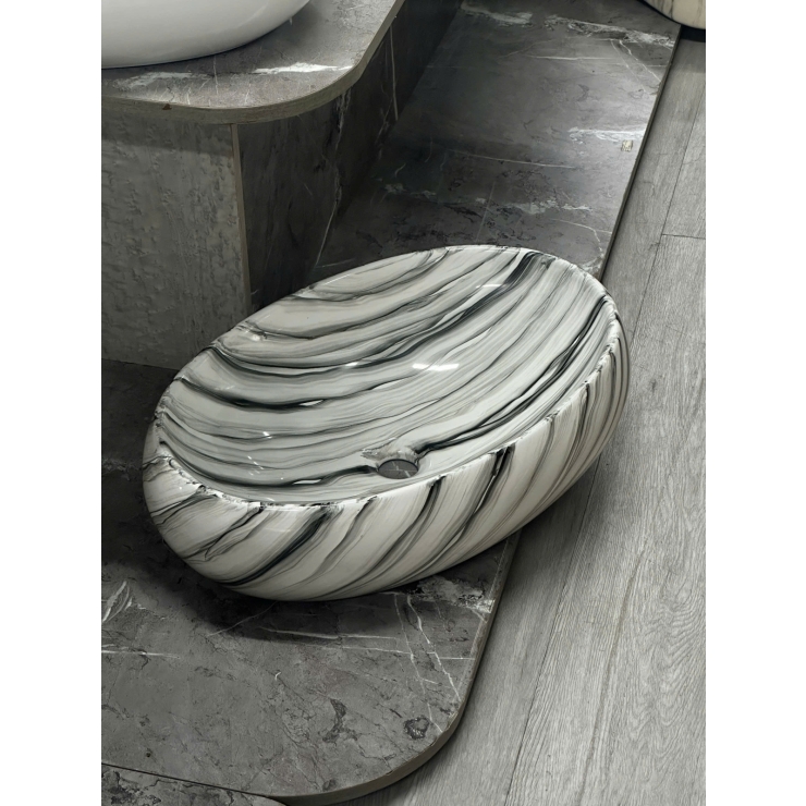 - Kiểu dáng: Lavabo Oval trắng vân đá đen xám, lòng chậu thiết kế đặc biệt chống bắn nước, mang nét tự nhiên hài hòa, làm cho không gian đặt chậu trở nên sang trọng, thanh thoát.