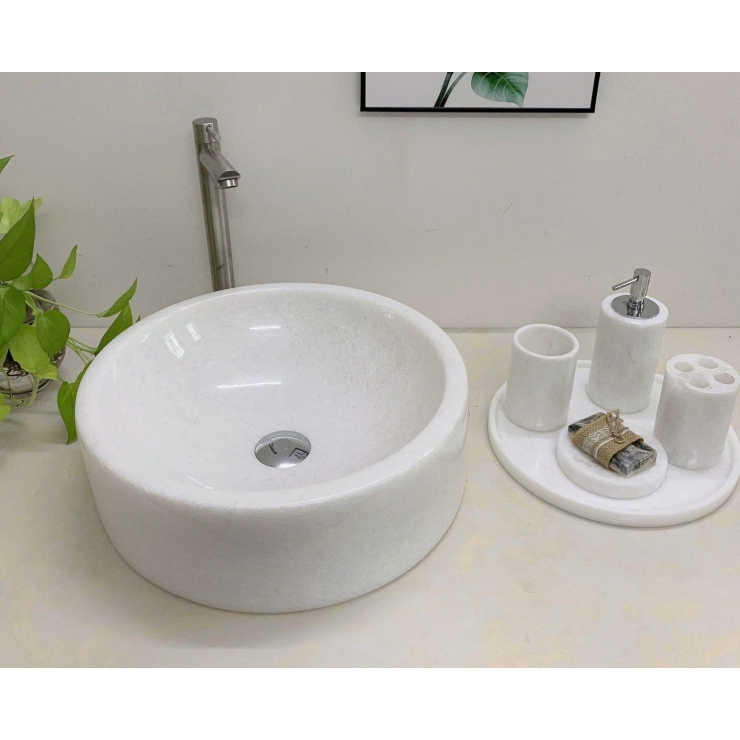 - Kiểu dáng: Lavabo trụ tròn, đá trắng pha lê nhẹ nhàng tự nhiên, lòng chậu thiết kế đặc biệt hơi vát xuống chống bắn nước, mang nét tự nhiên hài hòa cho không gian đặt chậu trở nên sang trọng, quý phái