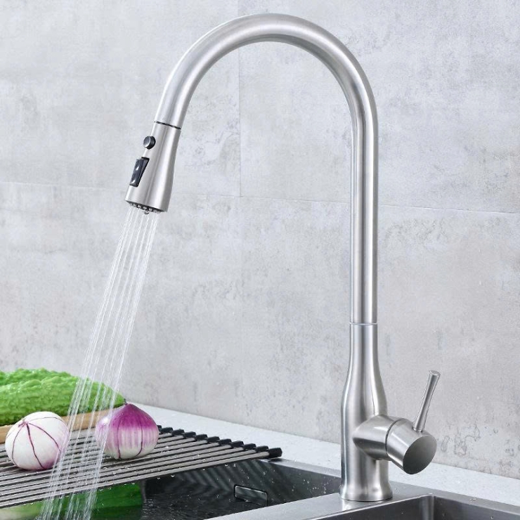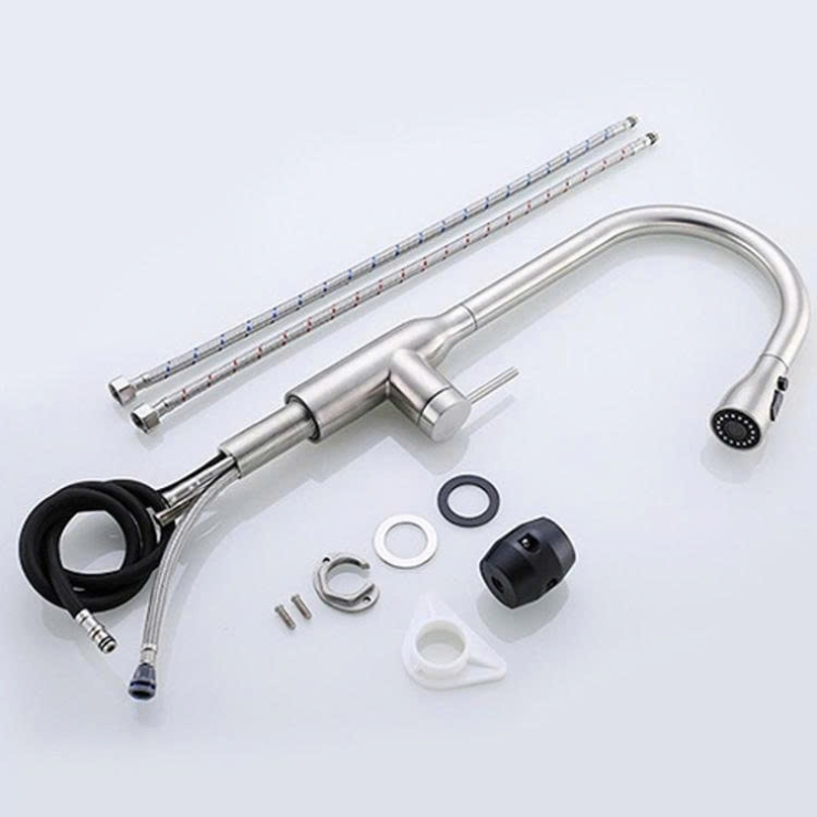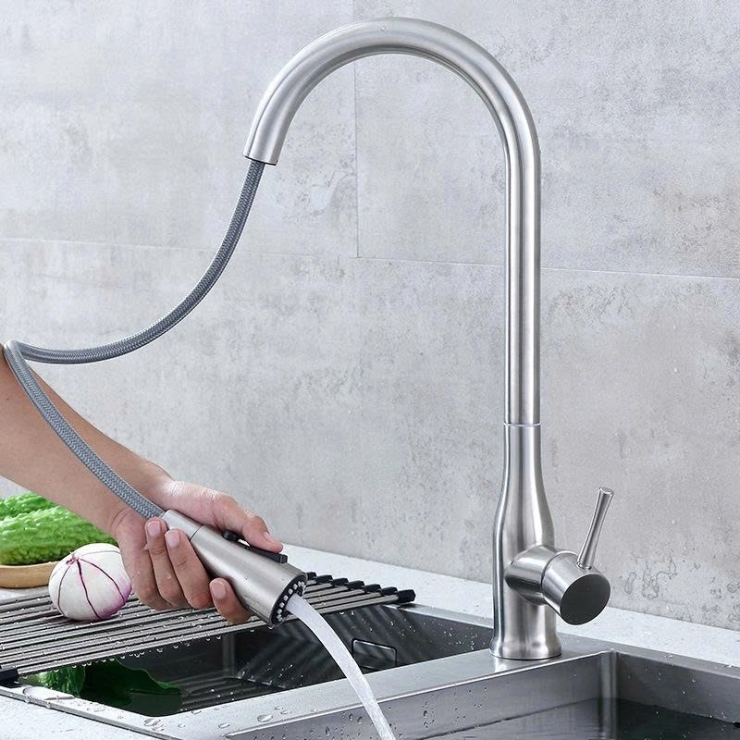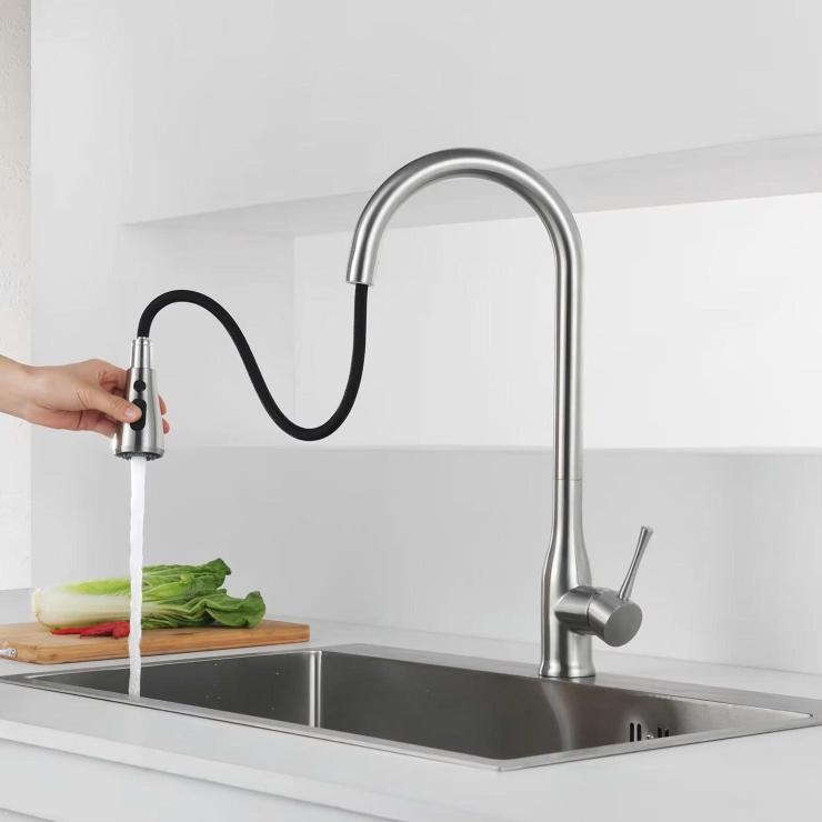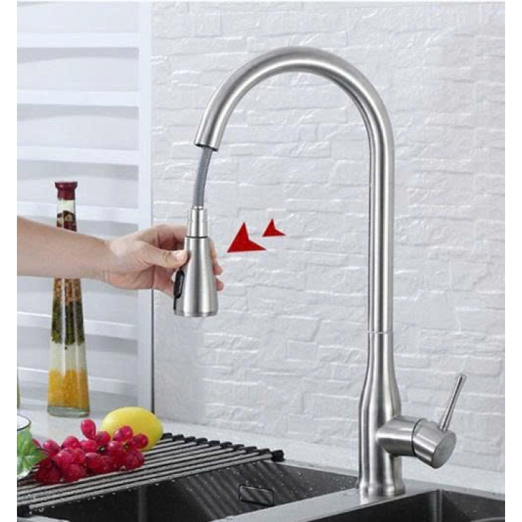 - Kiểu vòi có thể rút đầu vòi ra để vệ sinh xung quanh. Đầu vòi có thể rút dài ra khoảng 1-1,2 m để phun rửa xung quanh phạm vi bếp. Vòi nóng lạnh rất linh hoạt quay 306 độ. Trên đâu vòi có thể điều chỉnh các chế độ phun và ngắn nước tạm thời.