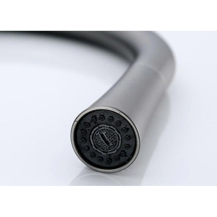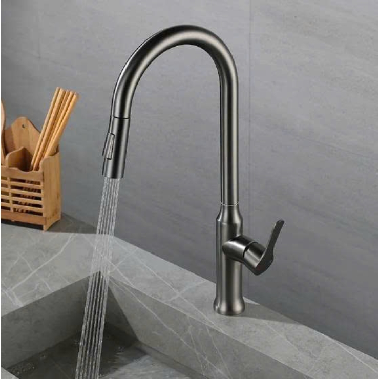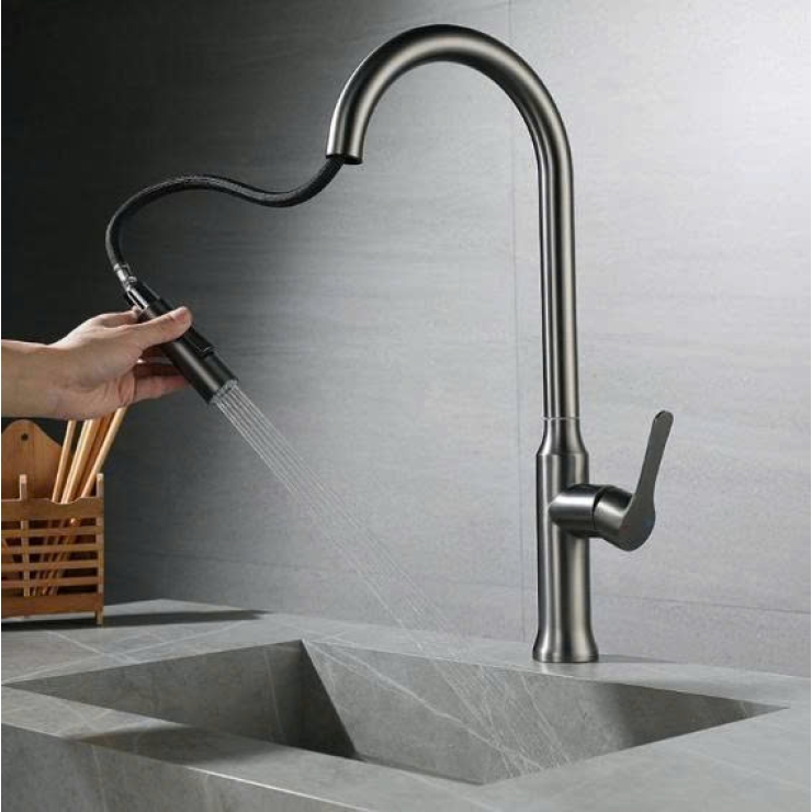 – Kiểu vòi có thể rút đầu vòi ra để vệ sinh xung quanh. Đầu vòi có thể rút dài ra khoảng 1-1,2 m để phun rửa xung quanh phạm vi bếp. Vòi nóng lạnh rất linh hoạt quay 306 độ. Trên đâu vòi có thể điều chỉnh các chế độ phun và ngắn nước tạm thời.