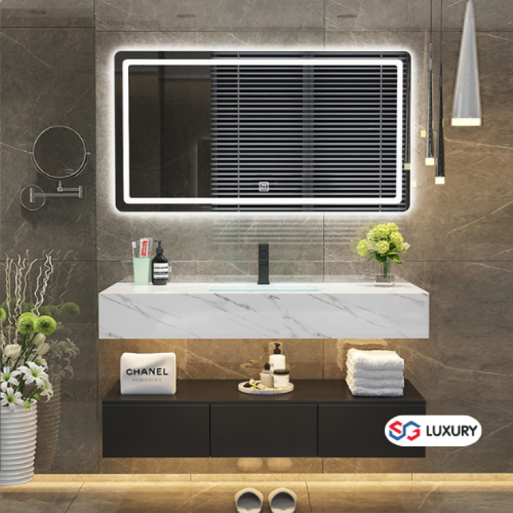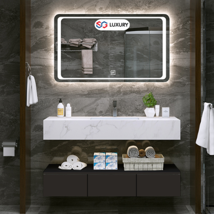 Bàn Đá Lavabo Âm 2 Tầng Vân Đen + Vòi + Gương Led LUSENTER (BD02)