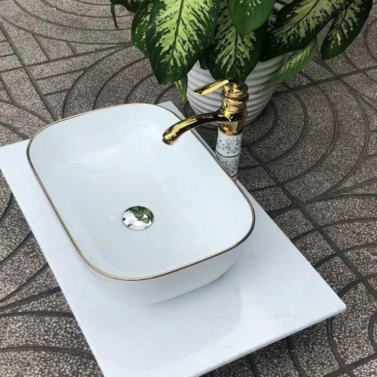 - Kiểu dáng: Lavabo chữ nhật bo góc, kết hợp viền vàng ở phần miệng chậu, lòng sâu có độ cong vừa đủ tránh bắn nước, tạo nét thanh lịch, sang trọng cho không gian của bạn