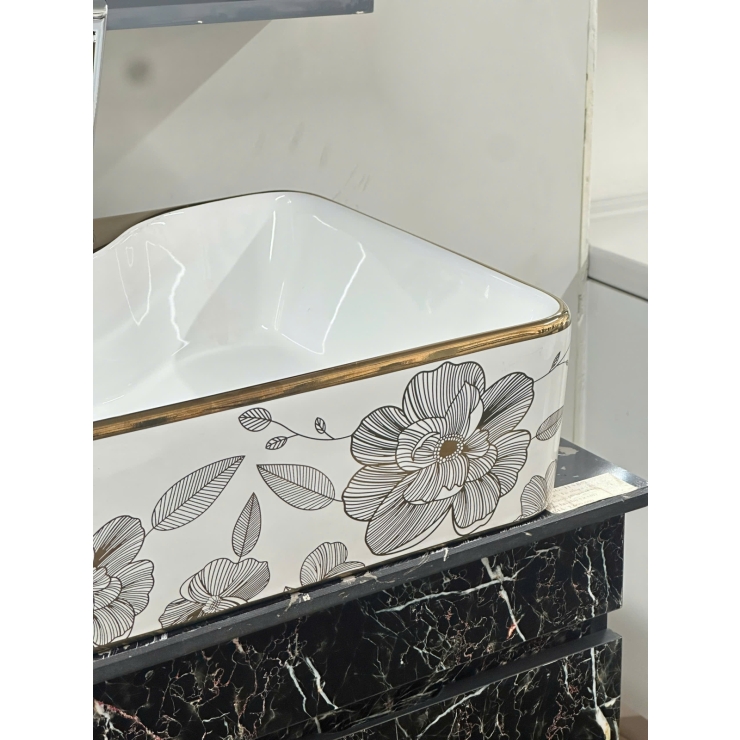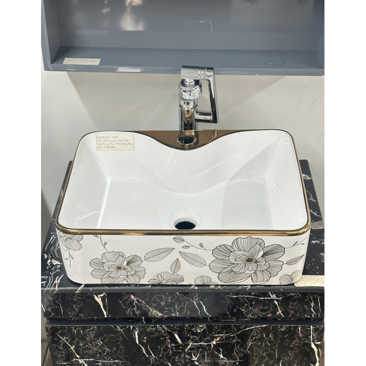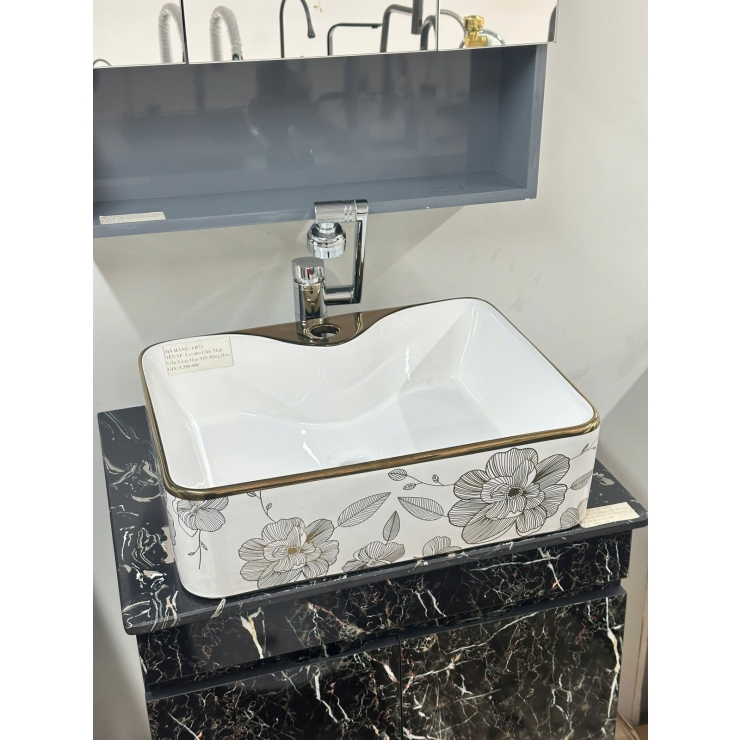 Lavabo Chữ Nhật Viền Vàng Họa Tiết Bông Hoa (LB73)