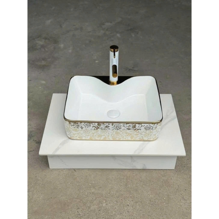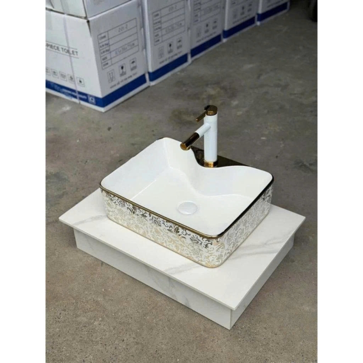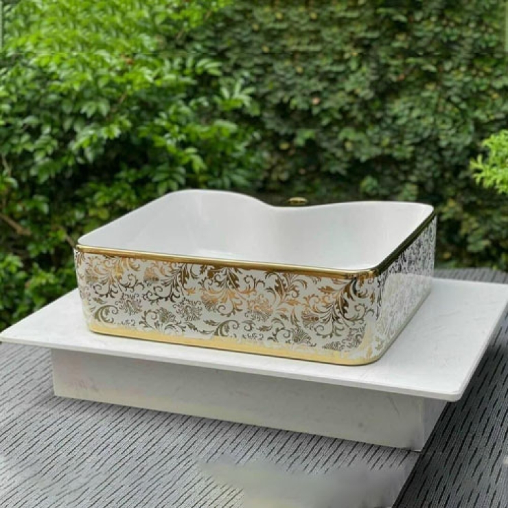 - Kiểu dáng: Lavabo chữ nhật trắng kẻ viền vàng ở miệng và đáy chậu, kết hợp họa tiết lá vàng phủ bóng mềm mại , lòng khuyết có chỗ để vòi chống bắn nước, mang đến không gian sang trọng, lấp lánh, thanh lịch cho phòng tắm của bạn