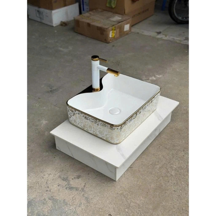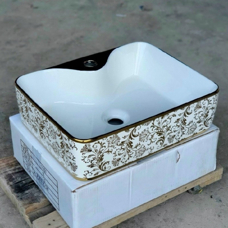 Lavabo Đặt Bàn Chữ Nhật Họa Tiết Lá Viền Vàng LUSENTER (LB24)