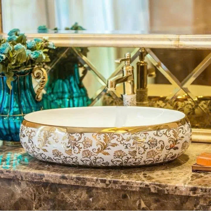 - Kiểu dáng: Chậu Lavabo Đặt Bàn Hình Elip viền vàng, kết hợp họa tiết lá vàng phủ bóng tinh sảo, lòng chậu có thiết kế đặc biệt giúp chống bắn nước, mang tính thẩm mĩ cao, làm cho không gian đặt chậu trở nên sang trọng, tinh tế, hài hòa (Có thể lắp đặt trên bàn đá hay tủ chậu).